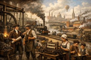 Revolusi Industri dimulai pada akhir abad ke-18, menandai transformasi besar dari ekonomi agraria menjadi produksi massal berbasis mesin dan uap. Perubahan ini tidak hanya mempengaruhi cara produksi, tetapi juga mengubah struktur sosial, pola urbanisasi, dan kebutuhan tenaga kerja. Fenomena ini bermula di Inggris dan kemudian menyebar ke seluruh Eropa, membentuk