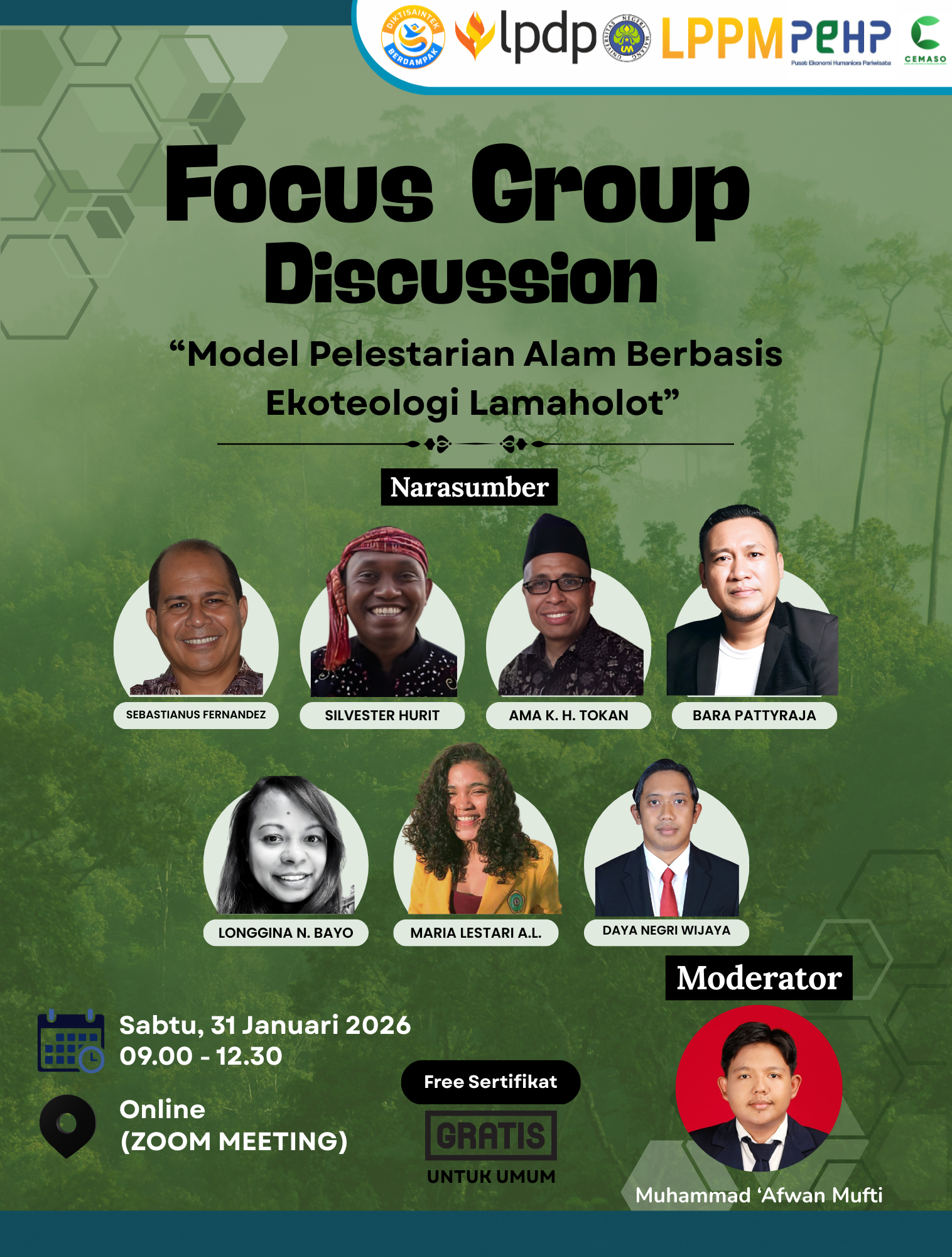 Malang – Tim peneliti Universitas Negeri Malang (UM) melalui Pusat Ekonomi, Humaniora, dan Pariwisata (PEHP) LPPM UM menyelenggarakan kegiatan Focus Group Discussion (FGD) bertajuk “Model Pelestarian Alam Berbasis Ekoteologi Lamaholot” pada Sabtu (31/1/2026) secara daring melalui Zoom Meeting. Kegiatan ini menjadi ruang ilmiah untuk menggali nilai-nilai kearifan lokal masyarakat Lamaholot dalam menjaga kelestarian alam melalui pendekatan ekoteologi.